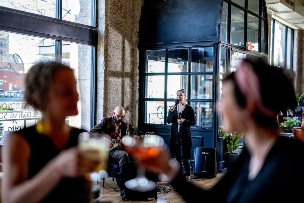 Grab something sparkling from Golden Hour and step into the stairwell for a rotating exhibit featuring local artists curated by Auric Gallery. Newest works by Tara Kelley-Cruz and Meghan Wilbar are on display through May 2026.
